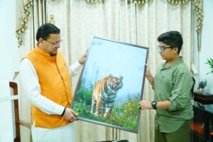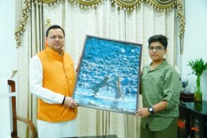 मुख्यमंत्री पुष्कर सिंह धामी से मुख्यमंत्री आवास में अंतरराष्ट्रीय बाघ दिवस के अवसर पर छात्र व प्रतिभाशाली वाइल्ड लाइफ फोटोग्राफर शौर्य प्रताप बिष्ट ने भेंट की | मुख्यमंत्री धामी ने शौर्य प्रताप बिष्ट की उत्कृष्ट रचनात्मक वन्य जीव फोटोग्राफी की प्रशंसा की तथा उन्हें सम्मानित किया |